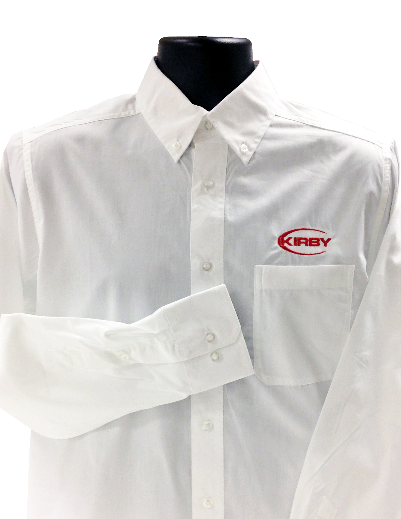 Made of 65% polyester and 35% cotton, these long sleeve dress shirts are made for easy care. White shirt embroidered with red Kirby logo. Button down collar.