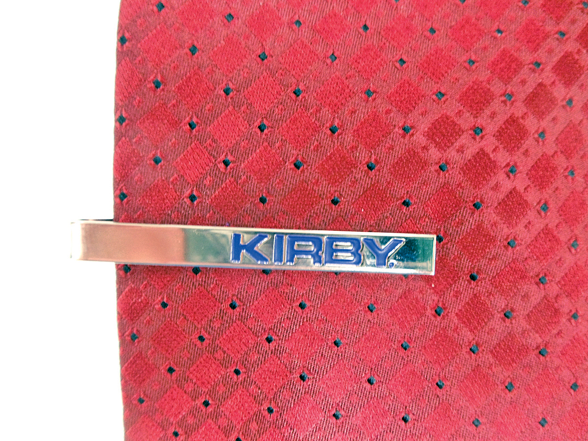Clips a tie to the dress shirt, ensuring the tie hangs straight and keeps it secured in place. Tension spring is light enough to prevent damage to fabric. Silvertone clip is 2” long and ¼” high with blue Kirby logo. Comes in a blue velvet pouch.